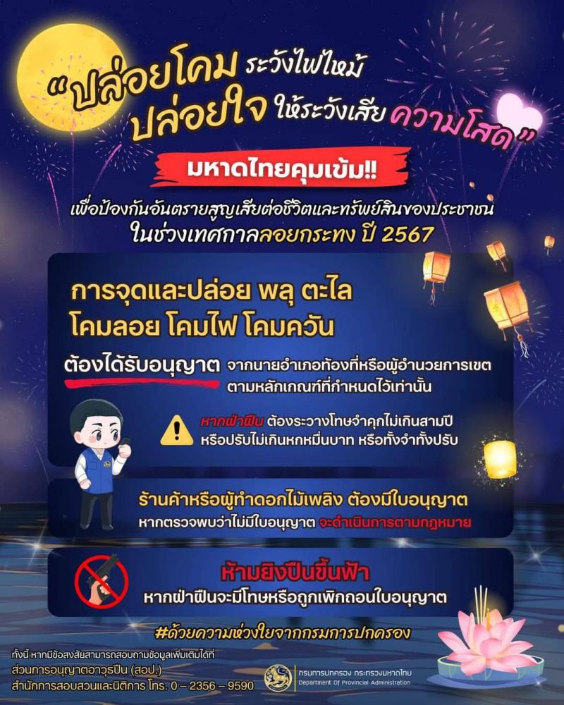 แจ้งประชาสัมพันธ์ เรื่อง การกวดขันการเล่นดอกไม้เพลิง การจุดและปล่อย พลุ ตะไล โคมลอย โคมไฟ โคมควัน และการใช้อาวุธปืนยิงขึ้นฟ้าโดยใช่เหตุ ในช่วงเทศกาลลอยกระทง 15 พฤศจิกายน 2567