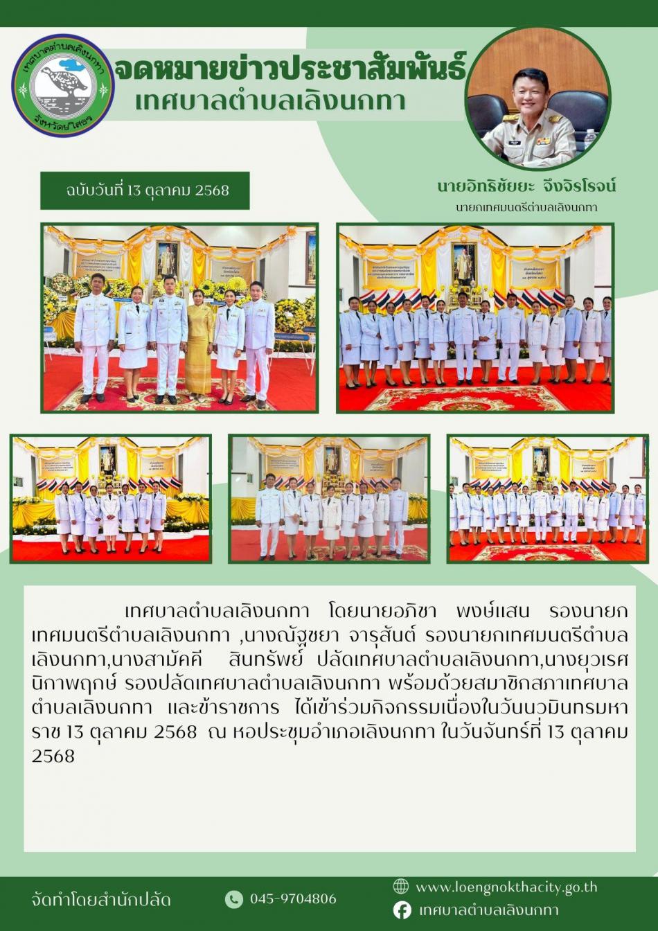 เทศบาลตำบลเลิงนกทา โดยนางณัฐชยา จารุสันต์ รองนายกเทศมนตรีตำบลเลิงนกทา ,ประธานสภาฯ ,สมาชิกสภาฯ ,ปลัดเทศบาลฯ , ผู้อำนวยการกองต่างๆ , หัวหน้าฝ่าย และ่พนักงานเทศบาลตำบลเลิงนกทา ได้เข้าร่วมพิธีวางพวงมาลาถวายสักการะ... [27 ตุลาคม 2568]