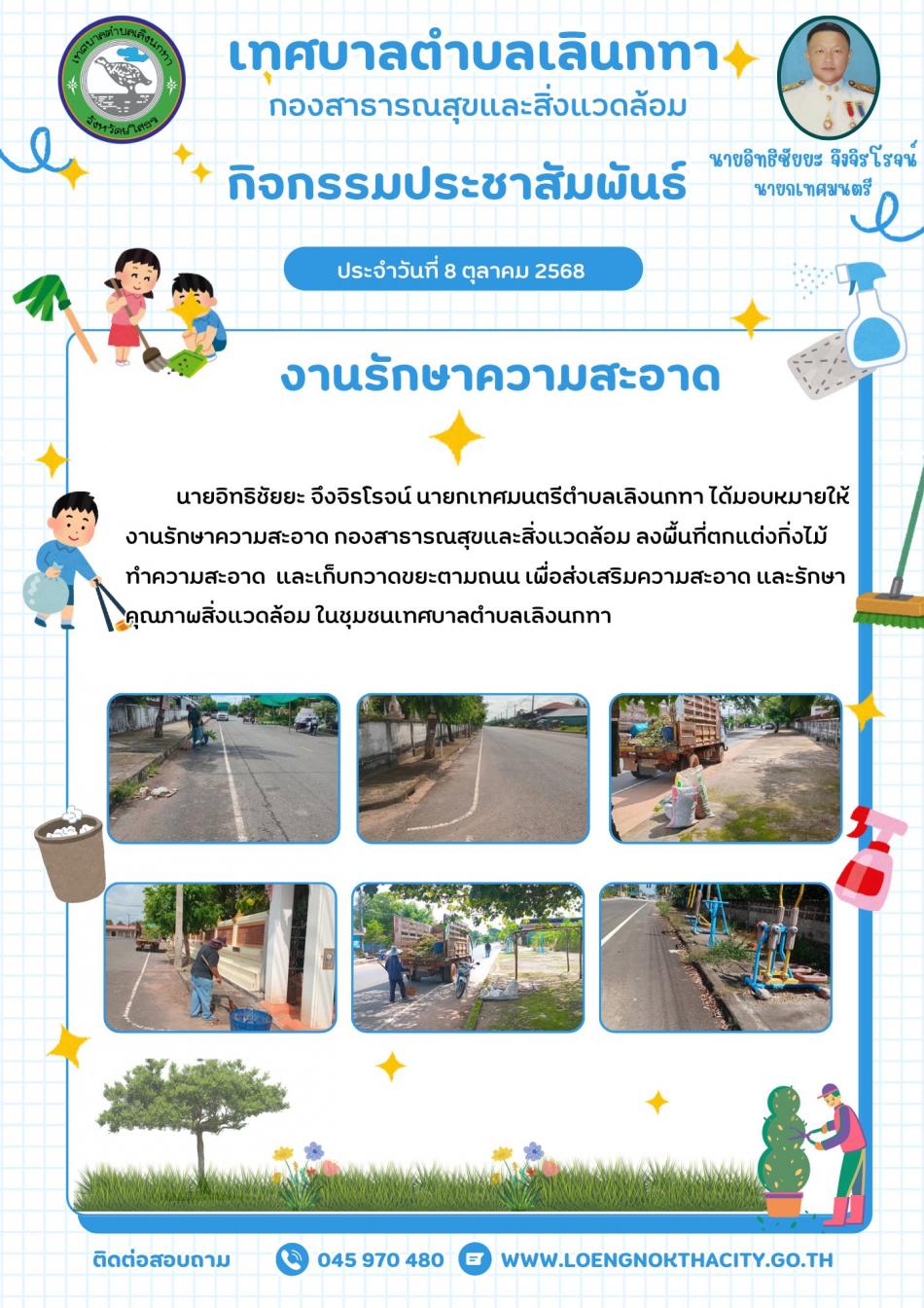 นายอิทธิชัยยะ จึงจิรโรจน์ นายกเทศมนตรีตำบลเลิงนกทา ได้มอบหมายให้งานรักษาความสะอาด กองสาธารณสุขและสิ่งแวดล้อม ลงพื้นที่ตกแต่งกิ่งไม้ ทำความสะอาดและเก็บกวาดขยะตามถนน... [9 ตุลาคม 2568]