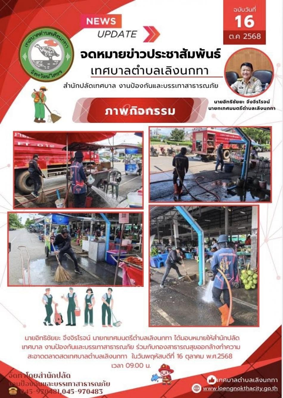 นายอิทธิชัยยะ จึงจิรโรจน์ นายกเทศมนตรีตำบลเลิงนกทา ได้มอบหมาย ให้สำนักปลัดเทศบาล งานป้องกันและบรรเทาสาธารณภัย ร่วมกับกองสาธารณสุขและสิ่งแวดล้อม ออกล้างทำความสะอาดตลาดสดเทศบาลตำบลเลิงนกทา ในวันพฤหัสที่ 16... [27 ตุลาคม 2568]