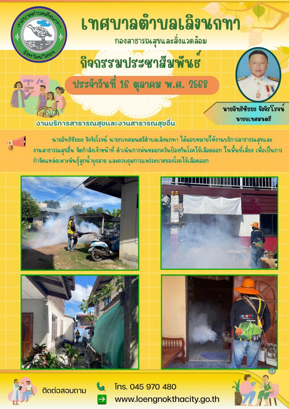 นายอิทธิชัยยะ จึงจิรโรจน์ นายกเทศมนตรีตำบลเลิงนกทา ได้มอบหมายให้งานบริการสาธารณสุขและงานสาธารณสุขอื่น จัดกำลังเจ้าหน้าที่ดำเนินการพ่นหมอกควันป้องกันโรคไข้เลือดออกในพื้นที่เสี่ยง... [27 ตุลาคม 2568]
