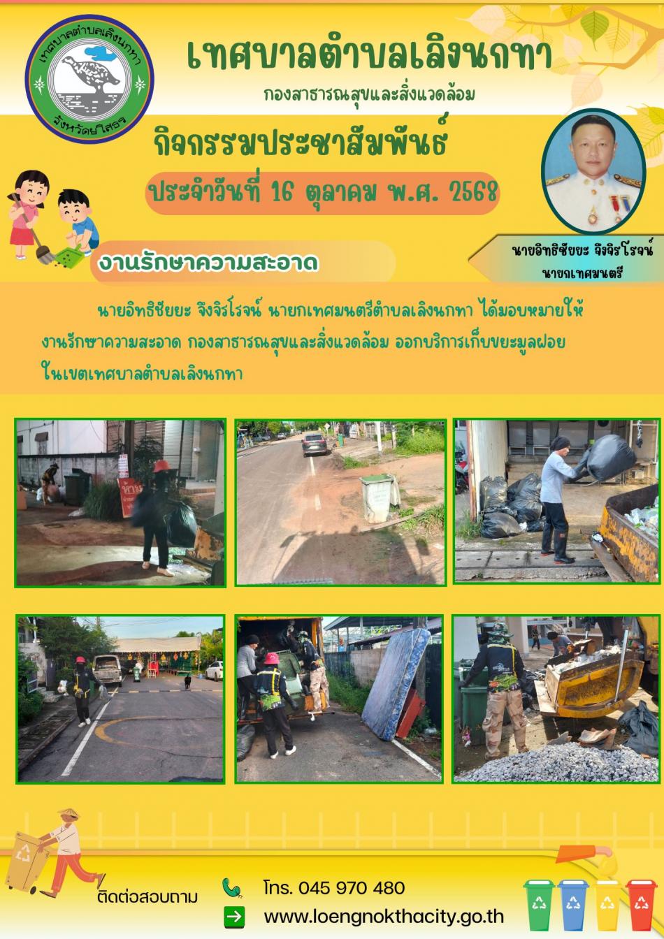นายอิทธิชัยยะ จึงจิรโรจน์ นายกเทศมนตรีตำบลเลิงนกทา ได้มอบหมายให้งานรักษาความสะอาด กองสาธารณสุขและสิ่งแวดล้อม ออกบริการเก็บขยะมูลฝอยในเขตเทศบาลตำบลเลิงนกทา [27 ตุลาคม 2568]