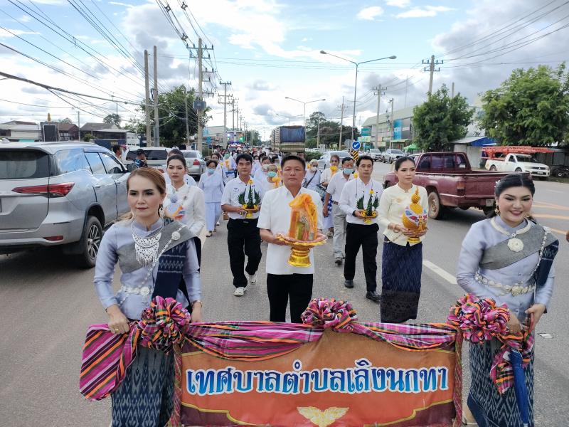 นายอิทธิชัยยะ จึงจิรโรจน์ นายกเทศมนตรีตำบลเลิงนกทา คณะผู้บริหาร สภาเทศบาล พนักงาน และชุมชน ร่วมกิจกรรมวันเข้าพรรษา ประจำปี 2565 [12 กรกฎาคม 2565]