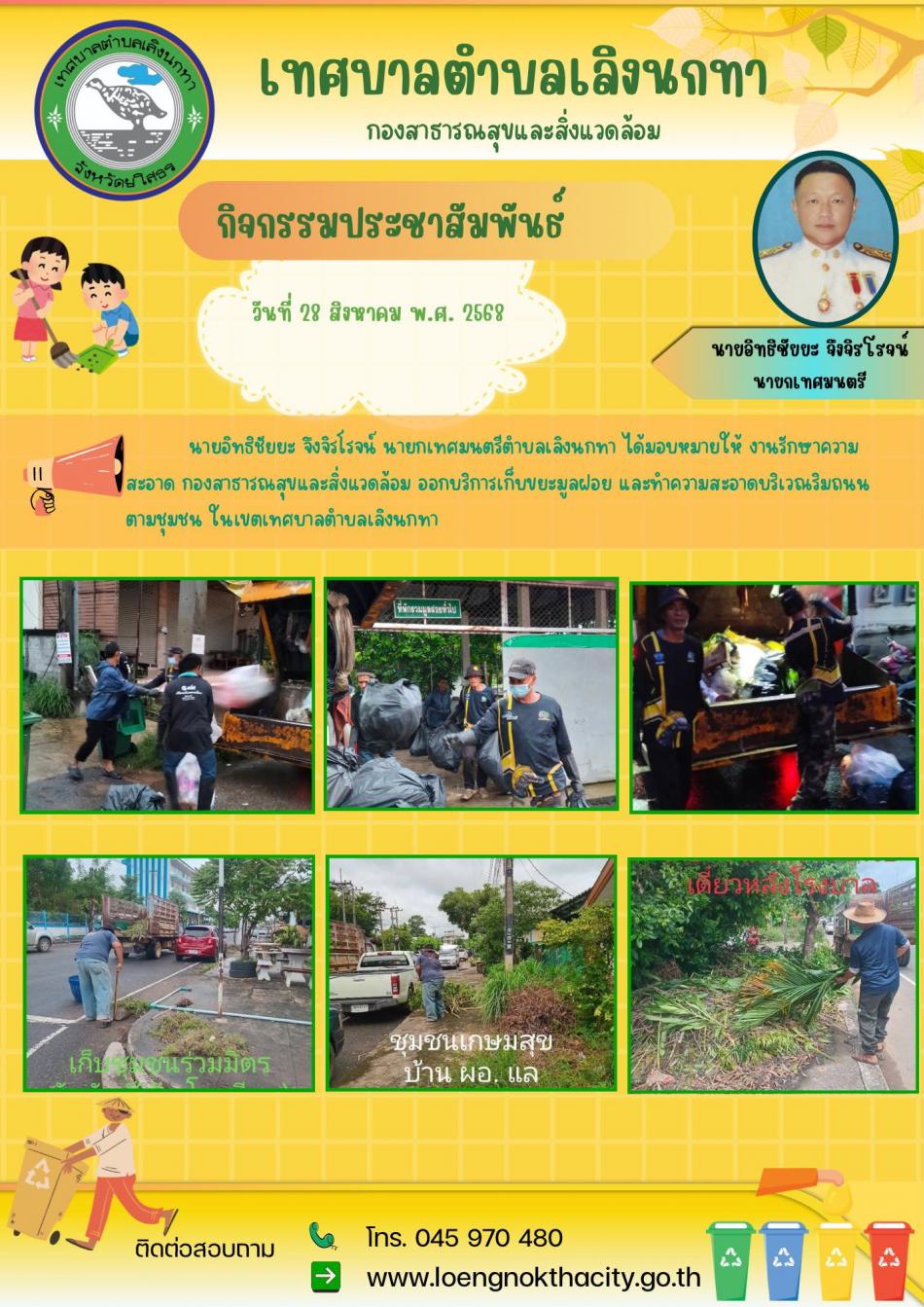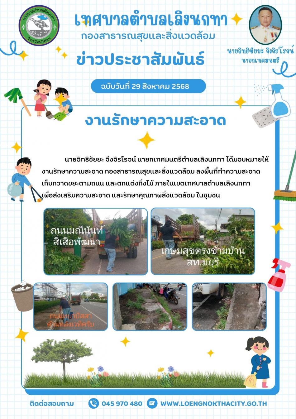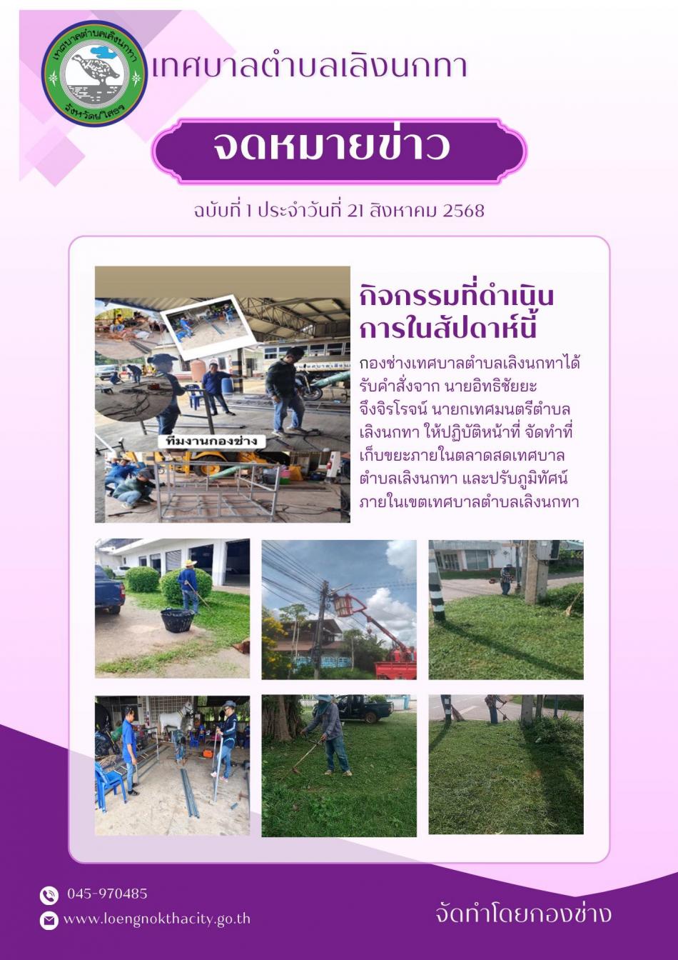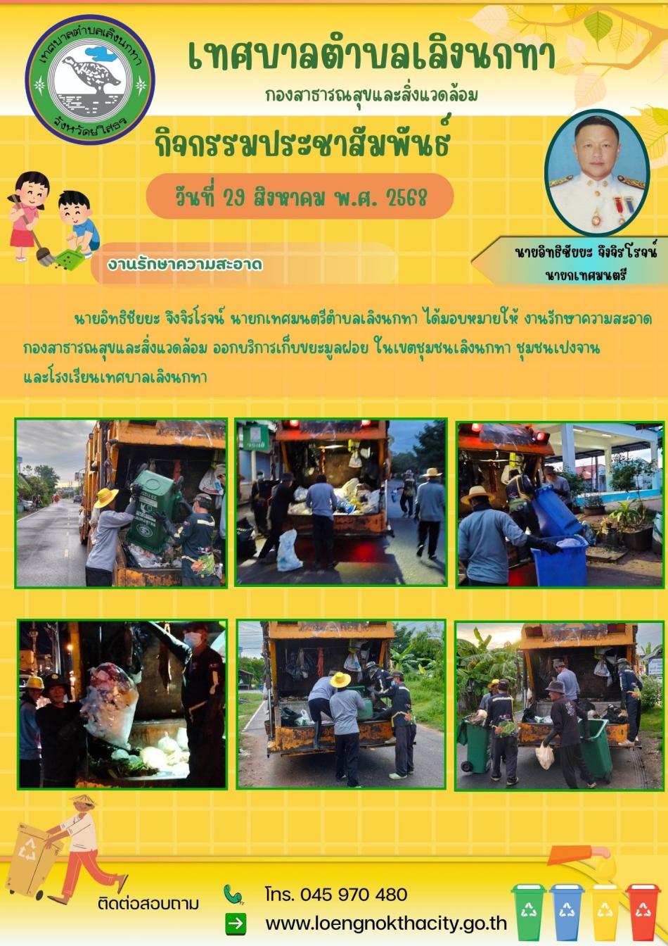 จดหมายข่าวประชาสัมพันธ์ประจำวันที่ 29 สิงหาคม 2568 1. นายอิทธิชัยยะ จึงจิรโรจน์ นายกเทศมนตรีตำบลเลิงนกทาได้มอบหมายให้งานรักษาความสะอาด กองสาธารณสุขและสิ่งแวดล้อม ออกบริการเก็บขยะมูลฝอย ในเขตชุมชนเลิงนกทา... [17 กันยายน 2568]