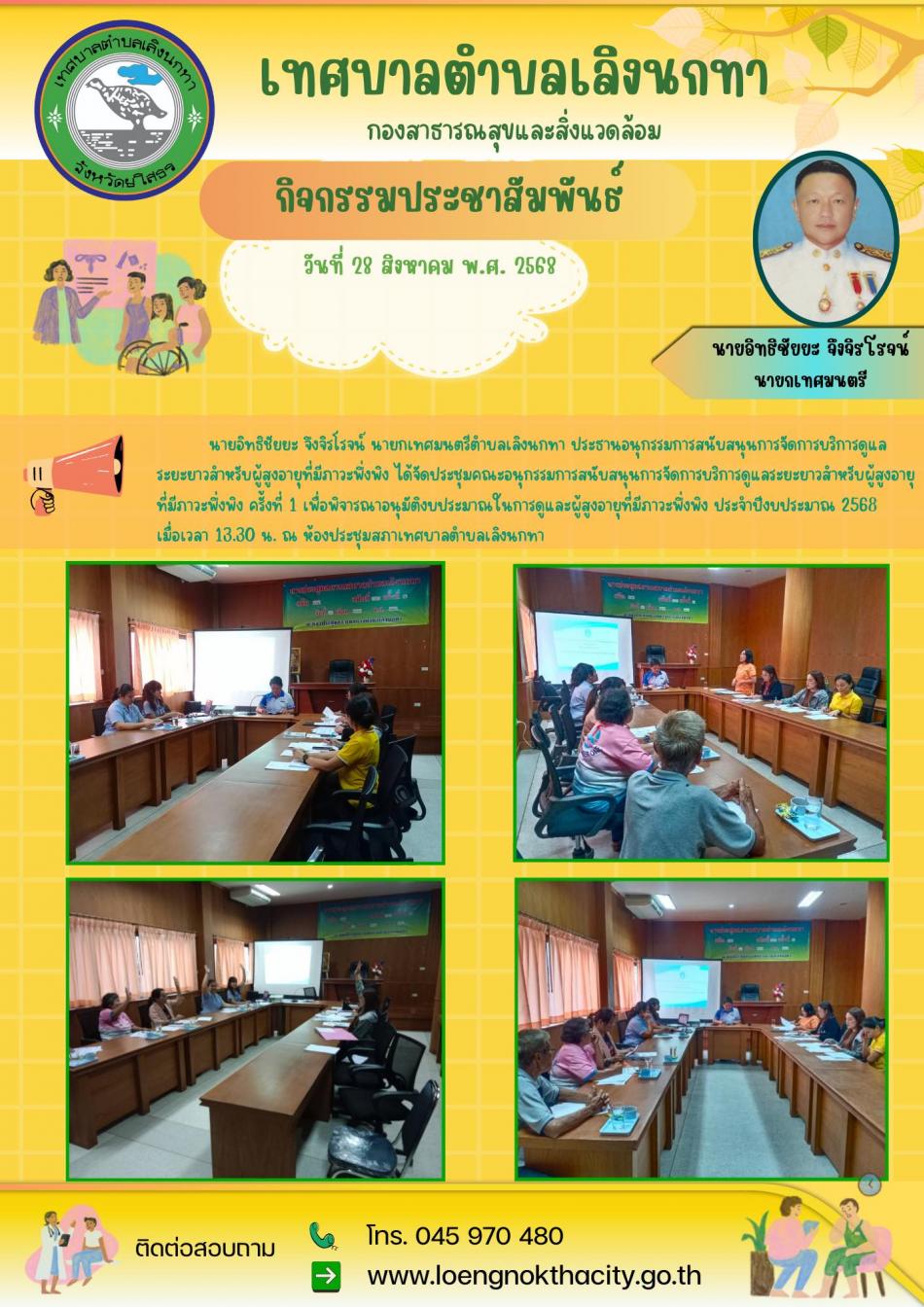 จดหมายข่าวประชาสัมพันธ์ประจำวันที่ 28 สิงหาคม 2568 1.นายอิทธิชัยยะ จึงจิรโรจน์ นายกเทศมนตรีตำบลเลิงนกทา ประธานอนุกรรมการสนับสนุนการจัดการบริการดูแลระยะยาวสำหรับผู้สูงอายุที่มีภาวะพึ่งพิง... [17 กันยายน 2568]