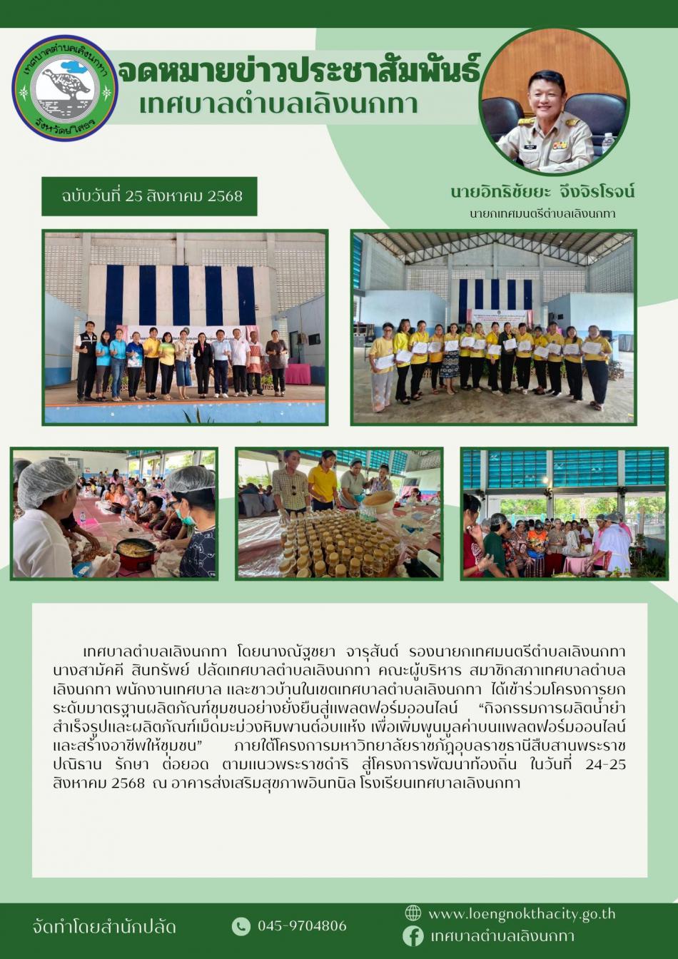 เทศบาลตำบลเลิงนกทา โดยนางณัฐชยา จารุสันต์ รองนายกเทศมนตรีตำบลเลิงนกทา นางสามัคคี สินทรัพย์ ปลัดเทศบาลตำบลเลิงนกทา คณะผู้บริหาร สมาชิกสภาเทศบาลตำบลเลิงนกทา พนักงานเทศบาล และชาวบ้านในเขตเทศบาลตำบลเลิงนกทา ... [17 กันยายน 2568]