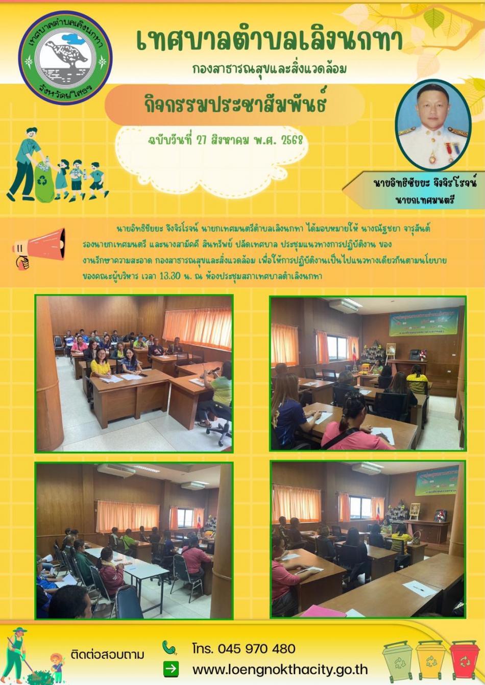 นายอิทธิชัยยะ จึงจิรโรจน์ นายยกเทศมนตรีตำบลเลิงนกทาได้มอบหมายให้ นางณัฐชยา จารุสันต์ รองนายกเทศมนตรีและนางสามัคคี สินทรัพย์ ปลัดเทศบาล ประชุมแนวทางการปฏิบัติงานของงานรักษาความสะอาด... [17 กันยายน 2568]