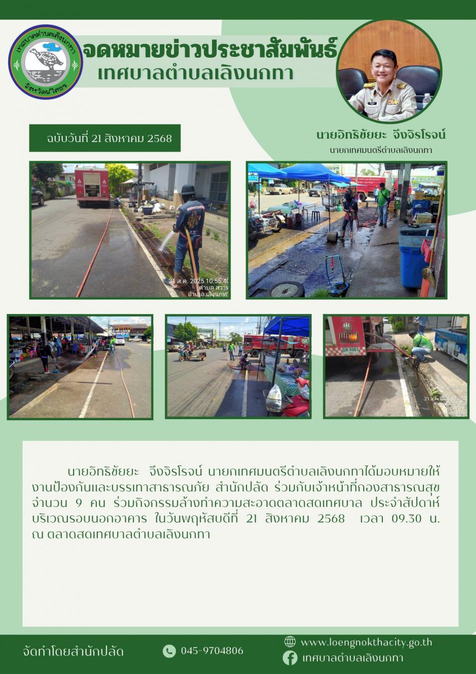 . นายอิทธิชัยยะ จึงจิรโรจน์ นายกเทศมนตรีตำบลเลิงนกทาได้มอบหมายให้ งานป้องกันและบรรเทาสาธารณภัย สำนักปลัด ร่วมกับเจ้าหน้าที่กองสาธารณสุข จำนวน 9 คน ร่วมกิจกรรมล้างทำความสะอาดตลาดสดเทศบาล ประจำสัปดาห์... [17 กันยายน 2568]