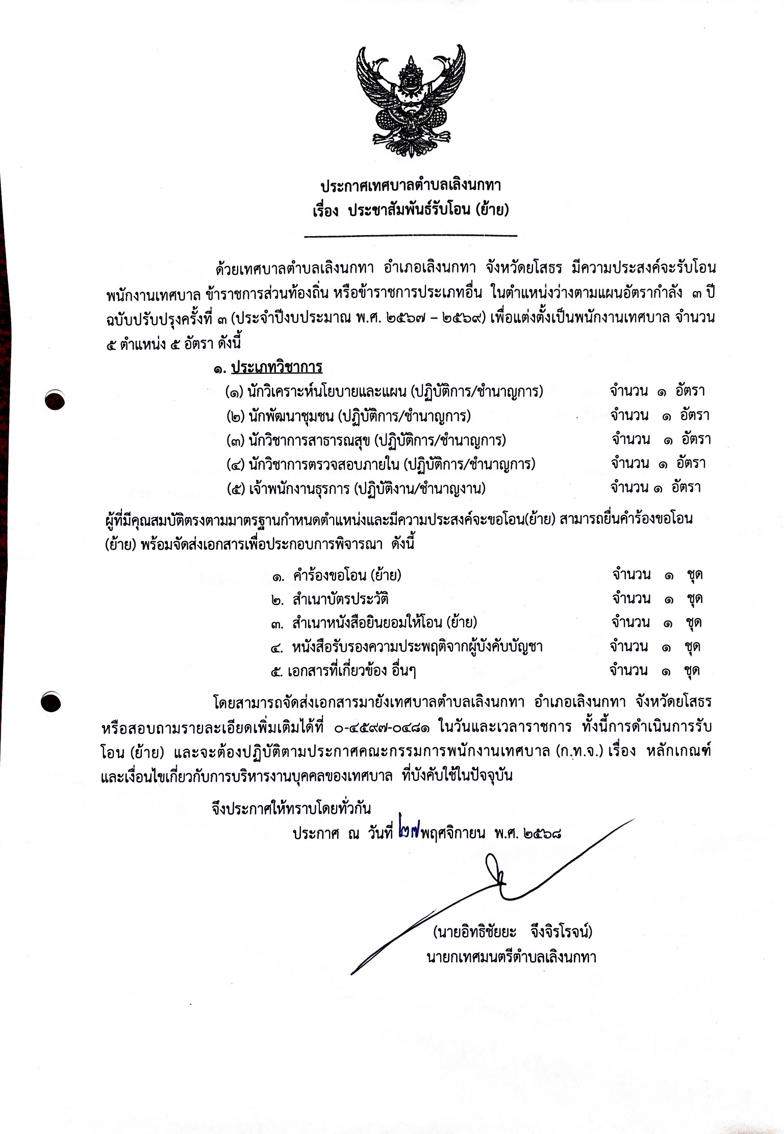 ประกาศเทศบาลตำบลเลิงนกทา เรื่อง ประชาสัมพันธ์รับโอน (ย้าย)