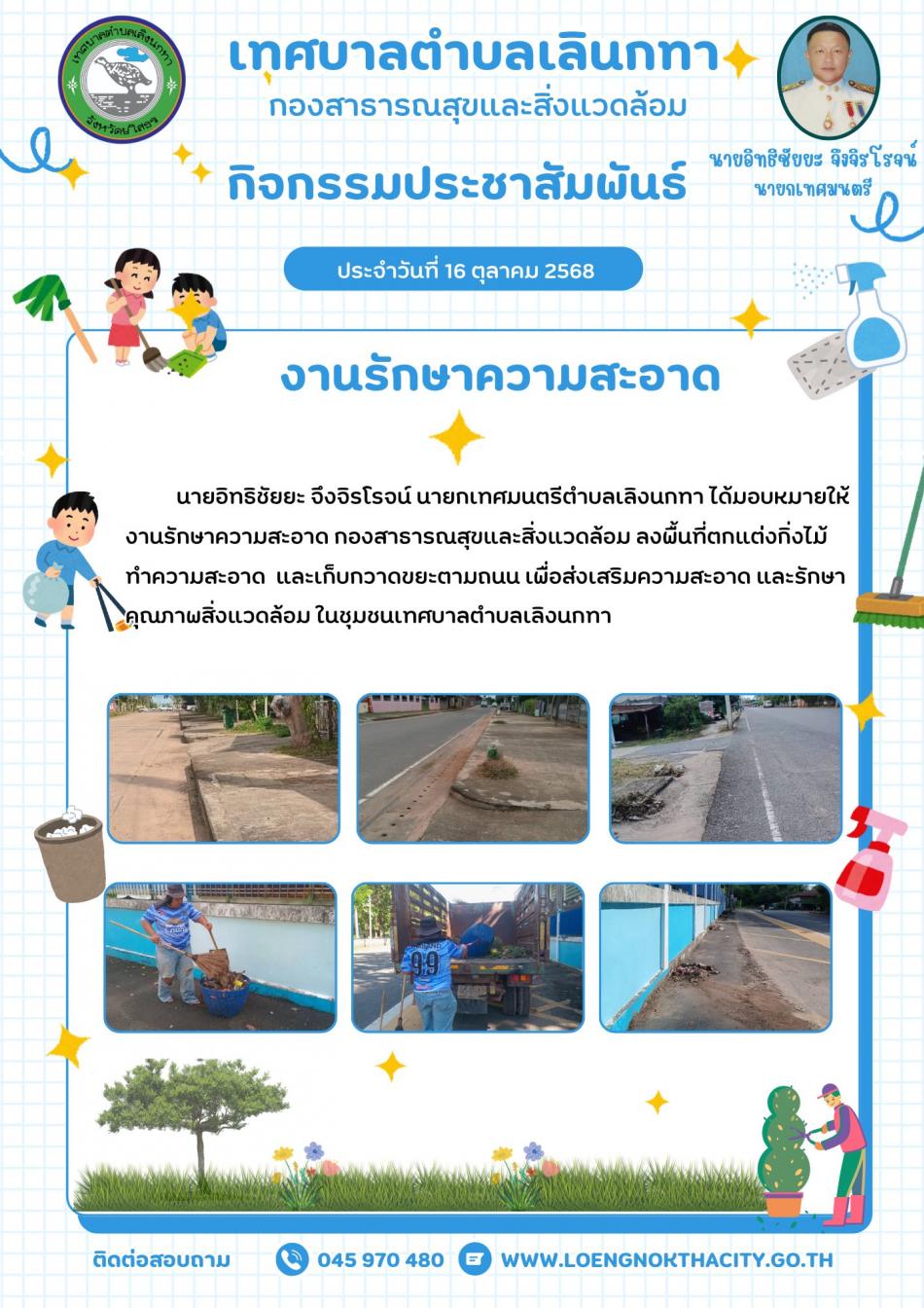 นายอิทธิชัยยะ จึงจิรโรจน์ นายกเทศมนตรีตำบลเลิงนกทา ได้มอบหมายให้งานรักษาความสะอาด กองสาธารณสุขและสิ่งแวดล้อม ออกบริการเก็บขยะมูลฝอยในเขตเทศบาลตำบลเลิงนกทา